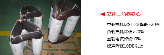 與目前國(guó)標(biāo)的S11型配電變壓器相比,立體卷鐵心一級(jí)能效變壓器空載損耗降低30%以上,負(fù)載損耗降低20%以上,總損耗降低25%以上??蛰d電流和噪聲水平均大幅度降低。